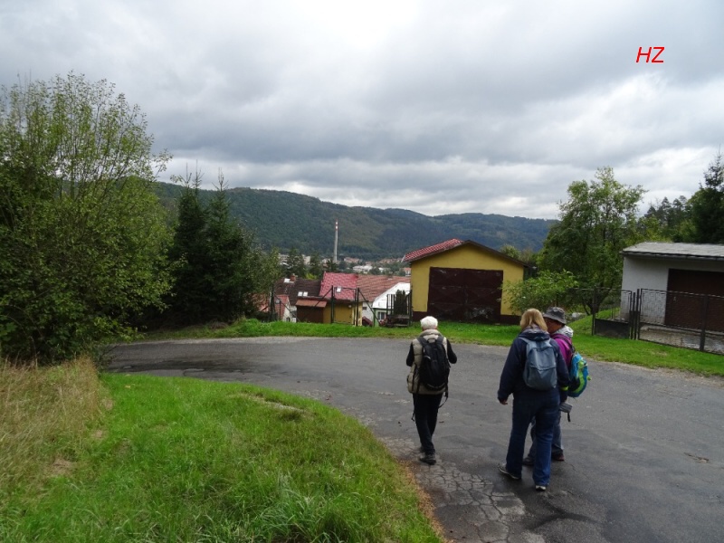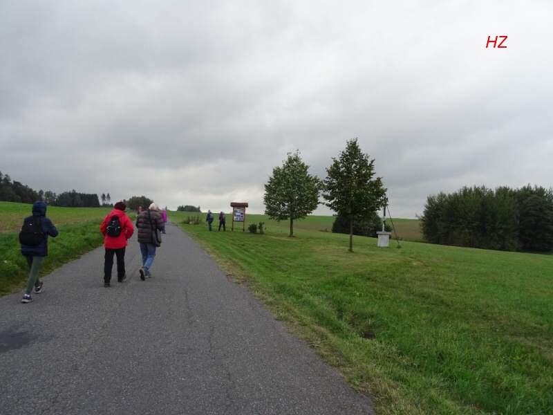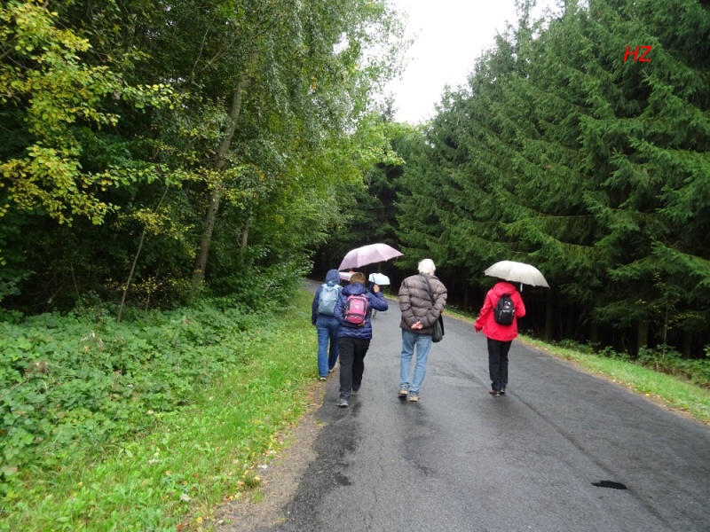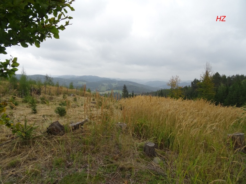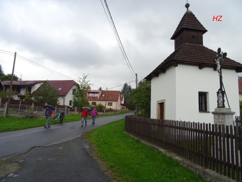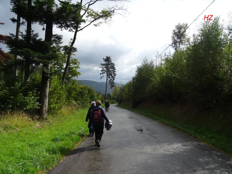 Za rozcestníkem Obecník s nadm. výškou 630 m n. n., nejvyšším bodem naší trasy, začíná pršet a my vcházíme do lesa