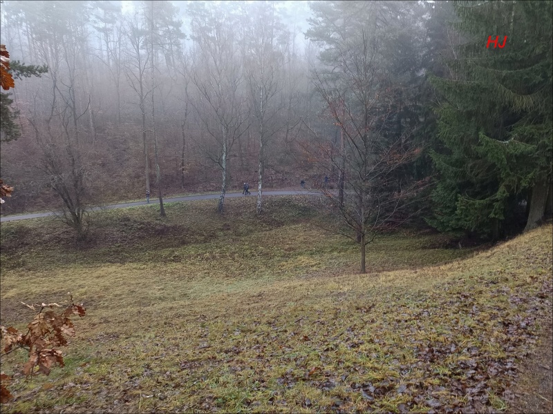 Cestou nás provází mlha, která zahaluje i palouk s lesoparkovou úpravou