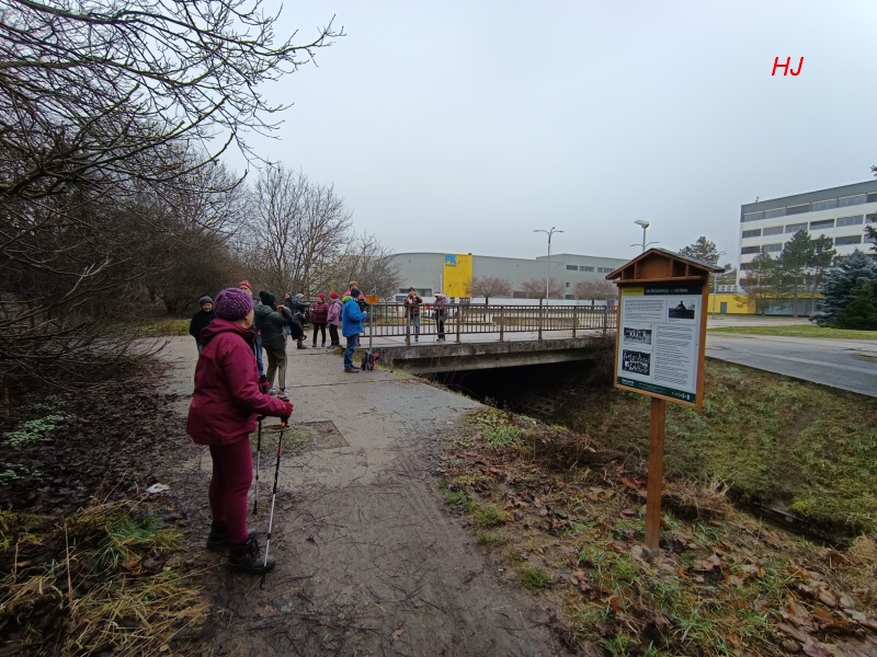 Na mostě přes říčku Ponávku se zastavujeme u informačního panelu o SK Řečkovice – fotbal...
