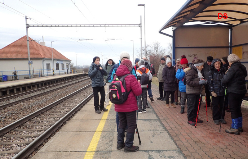 Na vlakové stanici ve Vojkovicích nad Svratkou vedoucí zahajuje vycházku pro 22 turistů