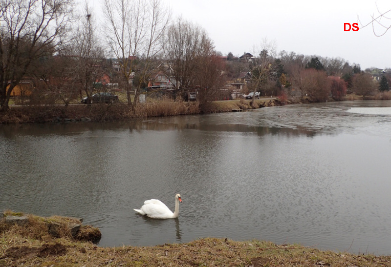 Na hladině rybníka plave osamělá labuť