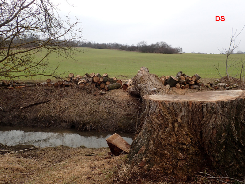 ... a pokračujeme podél potoka Šatava, kde vidíme vykácený strom a na břehu potoka vytěžené dřevo