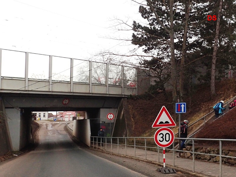 Rybník jsme obešli a u železničního viaduktu přecházíme silnici