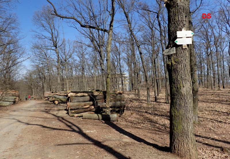 Lesoparkem přicházíme na rozcestí s modrou TZ u Myslivny