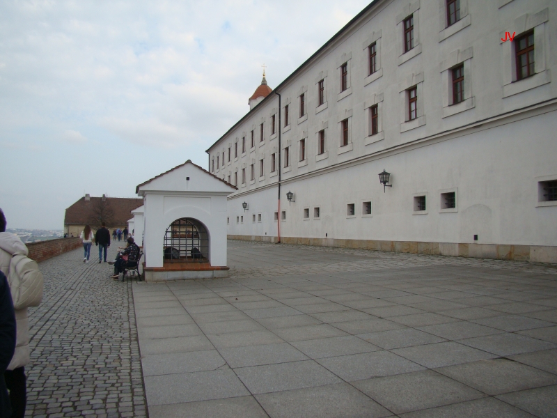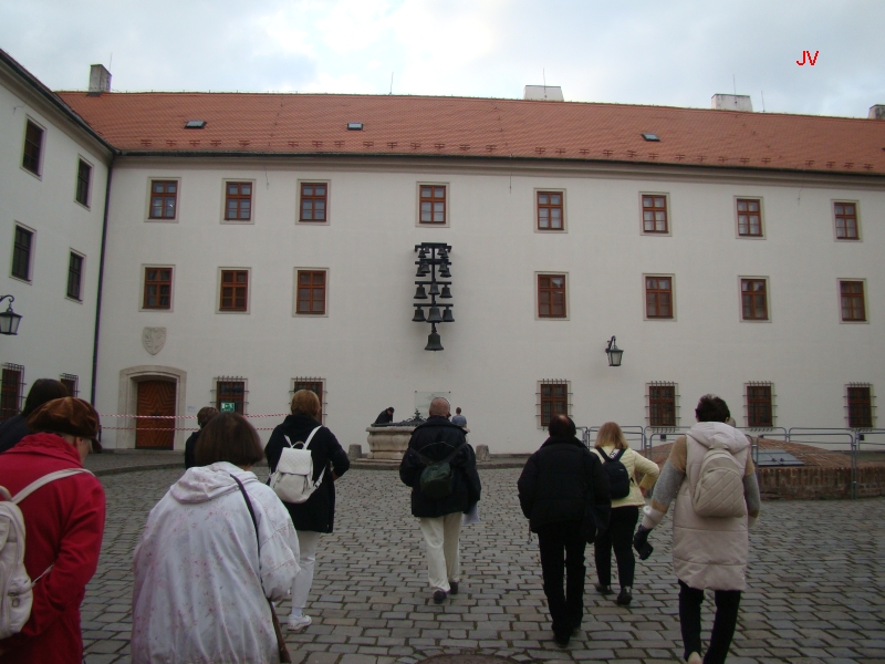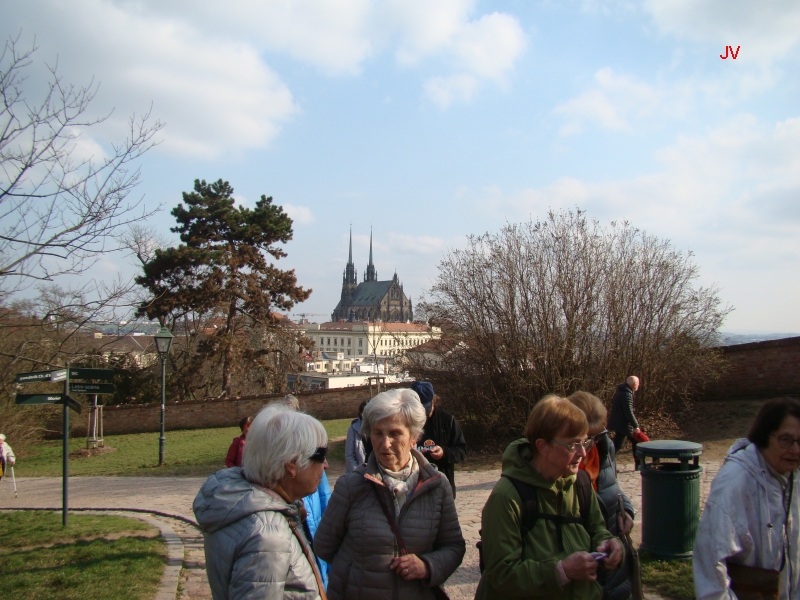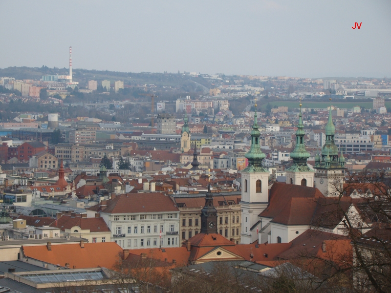 Úplně vpředu věžička Nové radnice, vedle kostel sv. Michala, vedle věž Staré radnice. Za Novou radnicí je věžička kostela sv. Josefa a za ní mariánský kostel na Křenové. Komín vzadu patří teplárně v Maloměřicích.