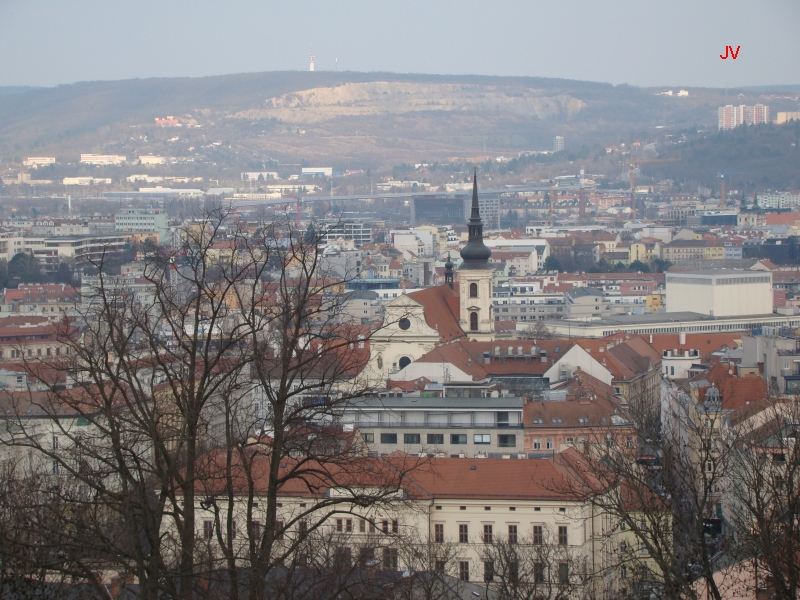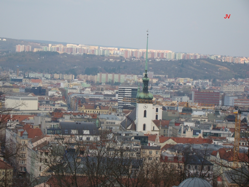 Ještě kostel sv. Tomáše, vedle něho Janáčkovo divadlo, a v pozadí vysílač Hády. Hotel Velká Klajdovka je tentokrát poblíž pravého horního rohu.