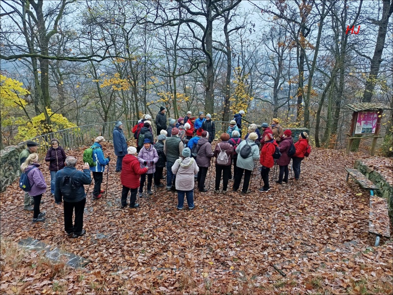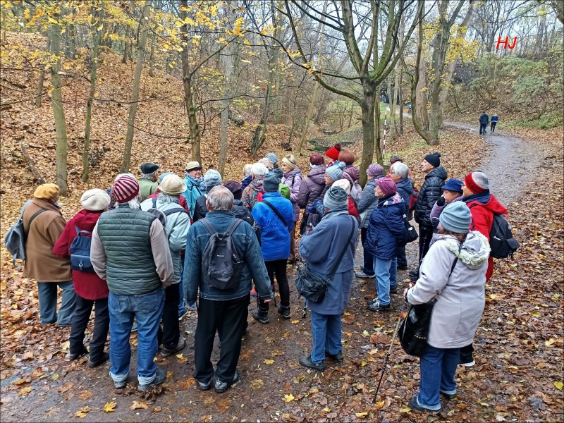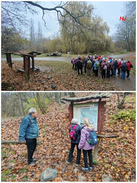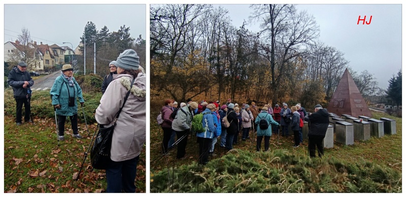 Vedoucí zahajuje dnešní vycházku v Novém Lískovci, u Pomníku obětem druhé sv.války a padlým Rudoarmějcům a seznamuje nás s historií i současných změnách tohoto místa