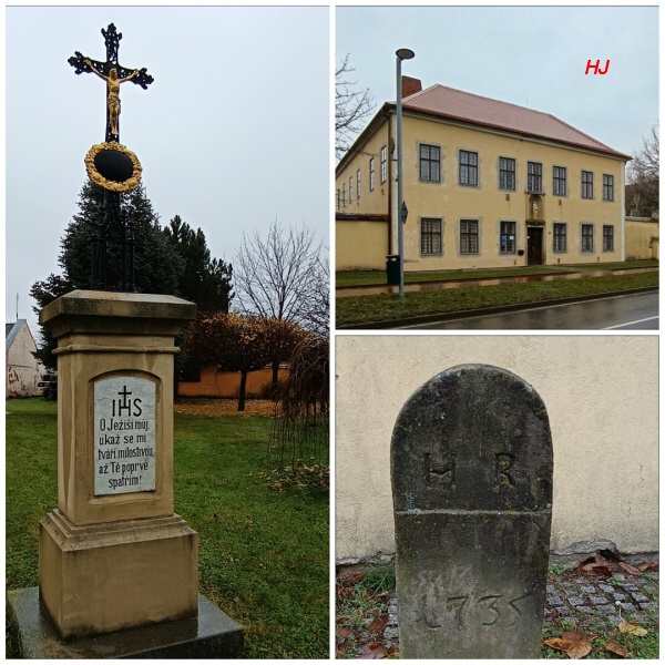 Procházíme kolem fary s prelaturou, kterou pravděpodobně navrhoval Jan Blažej Santini. U zdi se krčí hraniční kámen z roku 1735, který označoval hranici lesního katastru rajhradského benediktínského panství