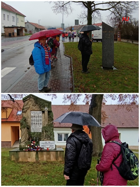 Zastavujeme se o pomníku padlých v 1. sv.válce, který byl po 2. sv.válce doplněn pamětní deskou se jmény občanů, kteří zemřeli na její následky. Naši pozornost zaujal i pilon, postavený v roce 1998 k 950 výročí první písemné zmínky o obci Ostrovačice