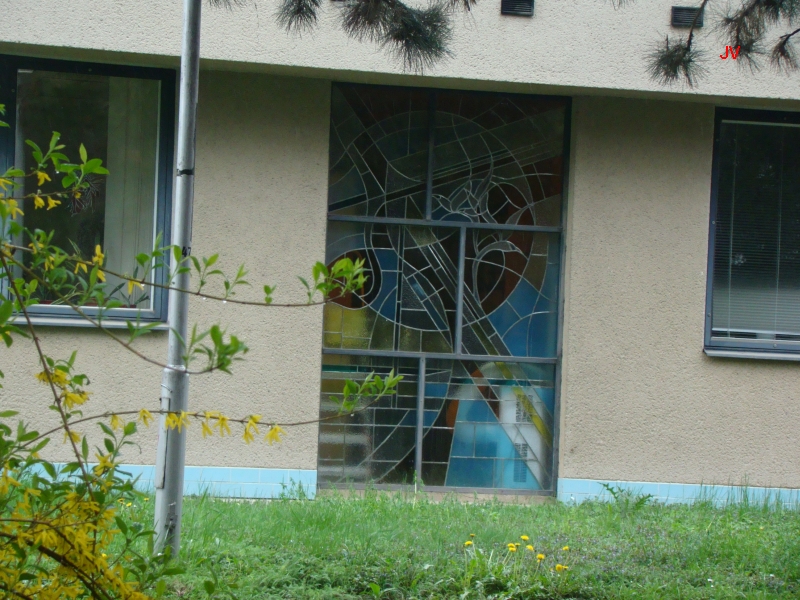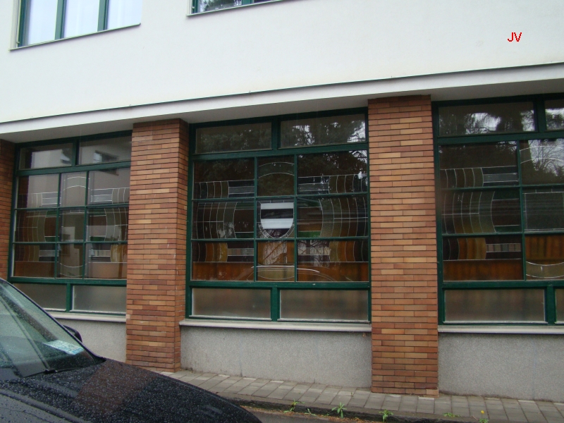 ....v níž bývala i kaple s vitrážemi v oknech. Vidíme zde i znak města Brna, které nechalo tento areál postavit.