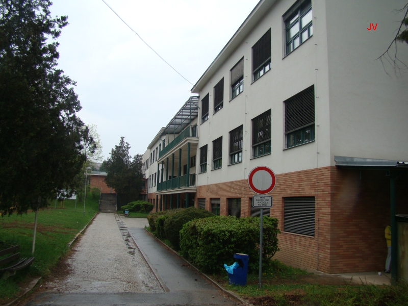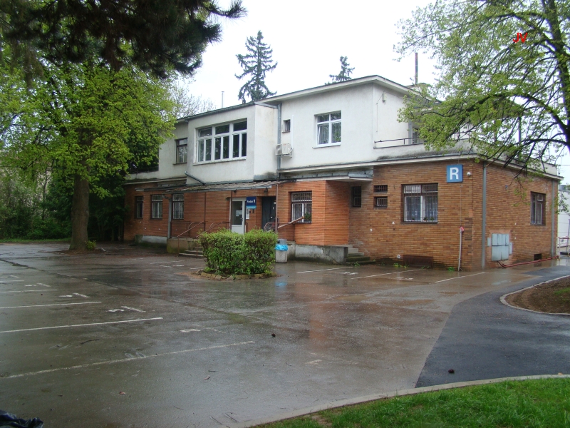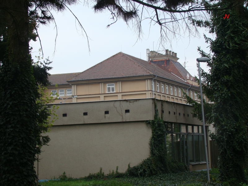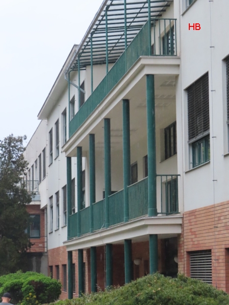 Vcházíme do areálu staré nemocnice. Dnes je spíš nazývána areálem Oskara Pořísky, podle architekta, který postavil tuto nadčasovou stavbu. Všimněte si krytého chodníku kolem budov i mezi budovami.