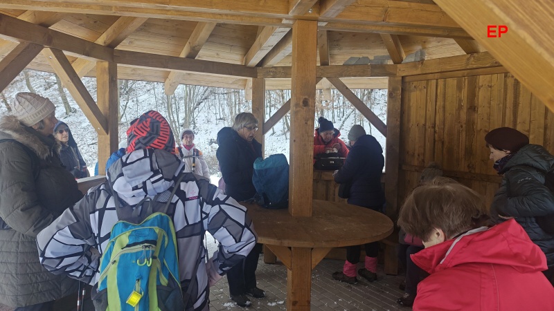 V pohodlném přístřešku u nádrže se jménem Jakub usedáme ke svačině a seznamujeme se s další částí dnešní trasy