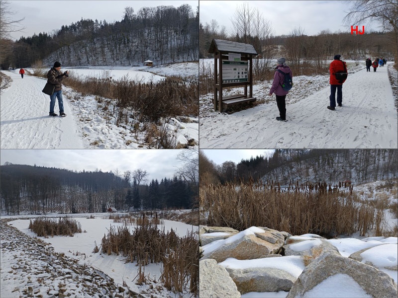 U přístřešku studujeme na informační tabuli informace o NS Bučín a pokračujeme dál k retenčním nádržím, které byly dobudovány v roce 2024