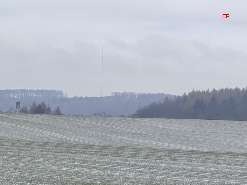 Bukovinka je vysoko položená, jsou odtud pěkné rozhledy. Teď vidíme vysílač Kojál.