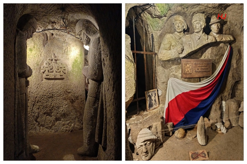 ... se nám nabízí pohled na Svatováclavskou korunu, kterou hlídají dva rytíři, tak jak ji v pískovci vytesal Stanislav Rolínek a také pohled na legionáře, které jsou již dílem novodobým