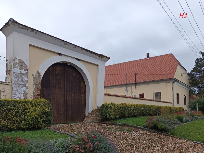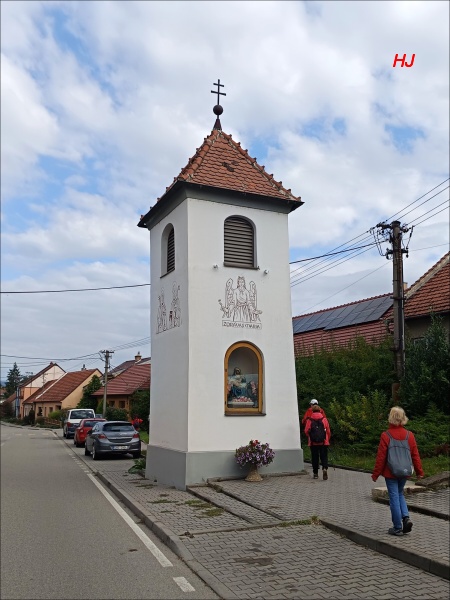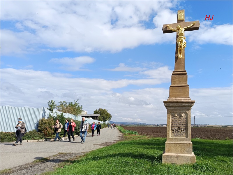 Do Šlapanic přicházíme kolem zemědělského areálu a kříže, který byl postaven v roce 1858, za odvrácení morové rány