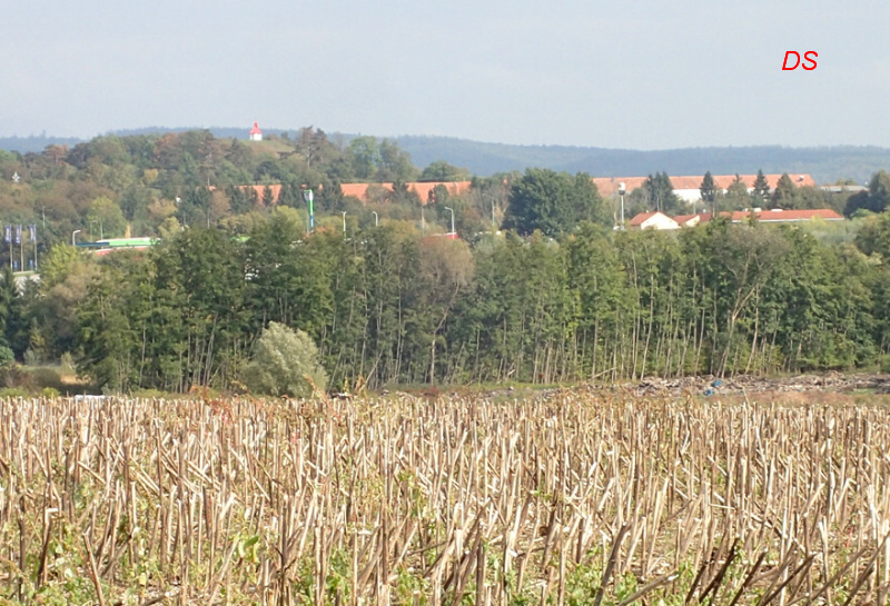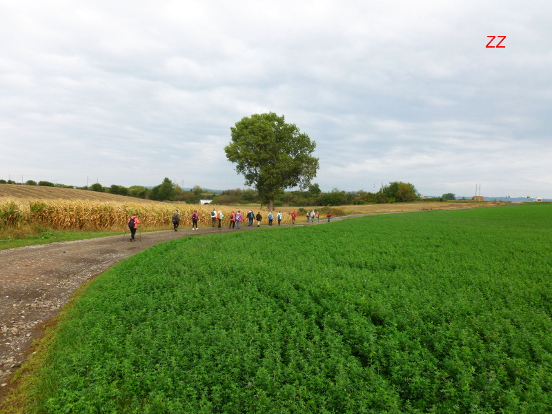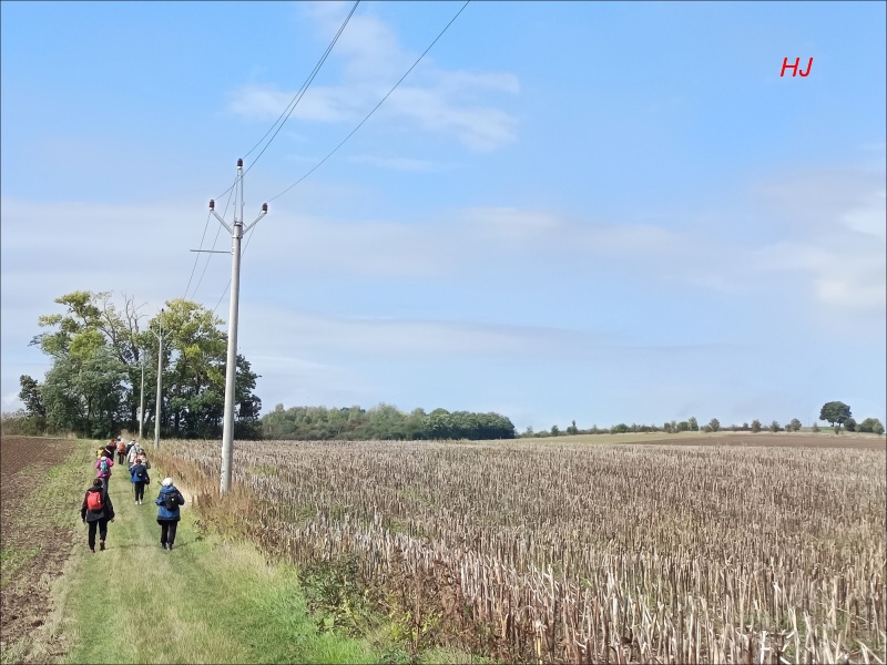 ... a vydáváme se směrem ke Šlapanicím, kde vpravo na obzoru identifikujeme vzrostlý strom s mohylou Žuráň...