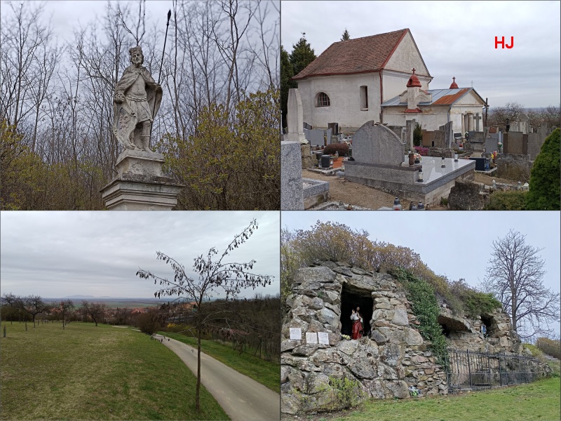 ... a pokračujeme k soše sv. Václava, ke hřbitovní kapli sv. archanděla Michaela a opět se nám nabízí zajímavý pohled na Pálavu