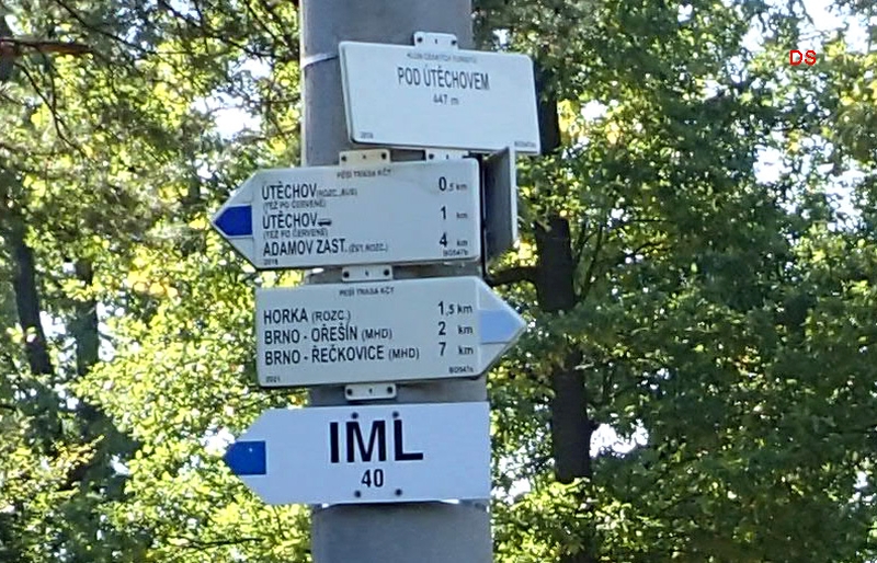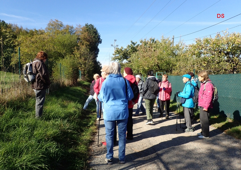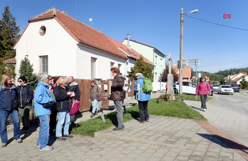 Na zastávce Útěchov rozcestí vedoucí zahajuje vycházku.