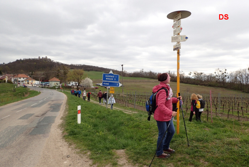 Po sestupu nás čeká odměna v podobě odpočinku a svačinky. Posilněni pokračujeme na Sirotčí hrádek, s výhledem z naší cesty na obec Klentnici