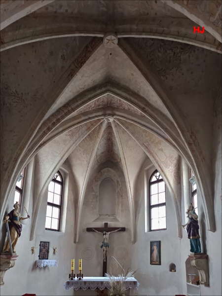 Další cennou památkou je vrcholně gotický presbytář s křížovou klenbou a zajímavými nástěnnými malbami, které byly památkáři objeveny při nedávném průzkumu