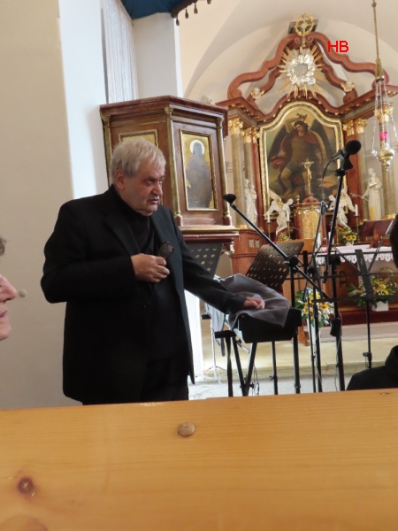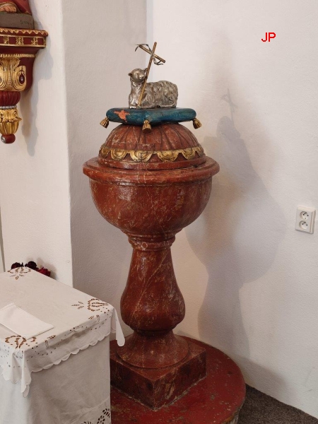 kazatelnu, křtitelnici a sochy svatých, též okna s vitrážemi i nástěnné malby.